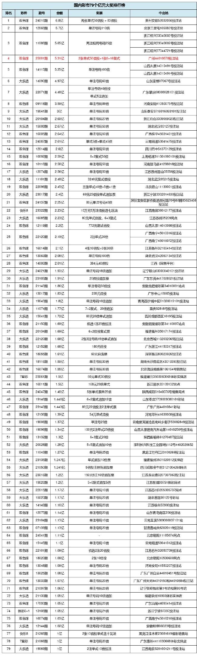 本次5.31亿巨奖,是福彩双色球游戏开出的第45个亿元奖,也是2025年双色球第1个亿元大奖,距离2024年11月28日晚深圳双色球2.25亿巨奖相隔35天。截止目前,本次5.31亿巨奖排名国内彩市亿元第4,也恰巧排名双色球亿元奖第4位,同时这也是国内彩市开出的第79个亿元奖!