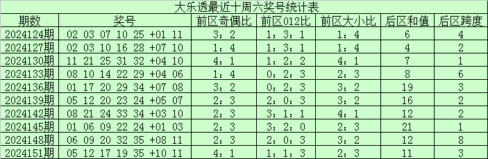 前区奇偶走势:上期前区奇偶比为3:2,上周六前区奇偶比4:1,最近十周六奇偶号码走势基本平衡,本期预计奇数号码转热,关注奇偶比3:2。