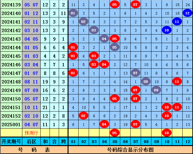 后区分析:上期后区奖号为04+07,开出一大一小组合,上周六后区奖号开出10+11,最近十周六后区奖号大小比为12:8,大号明显较热,本周六看好大号出现,参考一大一小组合,关注两码05、10。