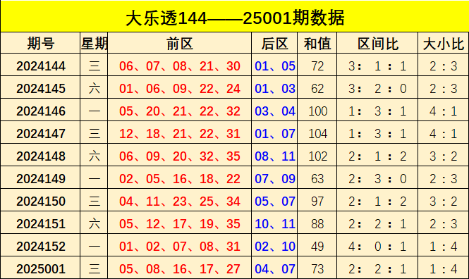 上期回顾:大乐透开奖号码:前区05 08 16 17 27+04 07,和值73,区间比2:2:1,大小比1:4。