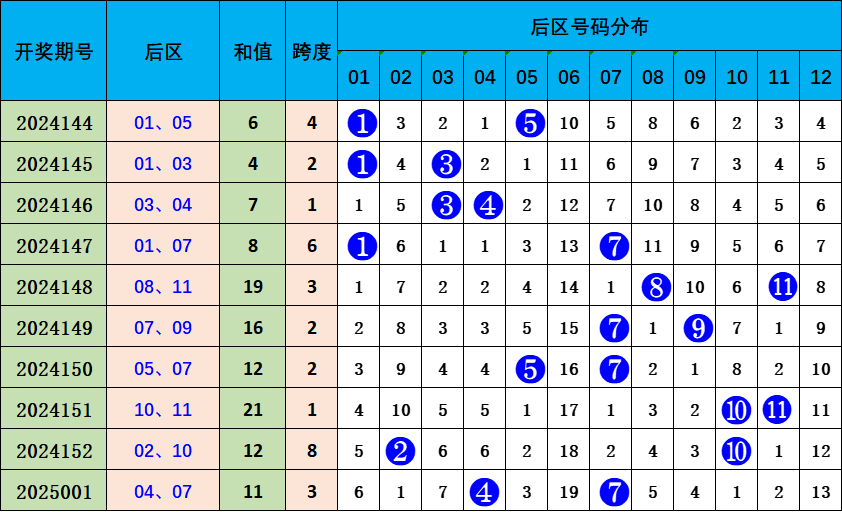上期后区号码为04号和07号,为小大偶奇组合,近10期后区号码大小总比值10:10,近10期后区号码奇偶总比值14:6,奇数号码走势较热,本期预计奇奇组合,后区两码关注05 09。