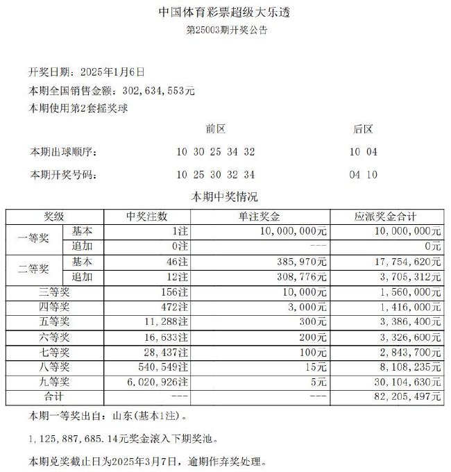 北京时间1月6日晚,体彩大乐透第25003期开奖,当期开奖号码为前区10 25 30 32 34,后区04 10。