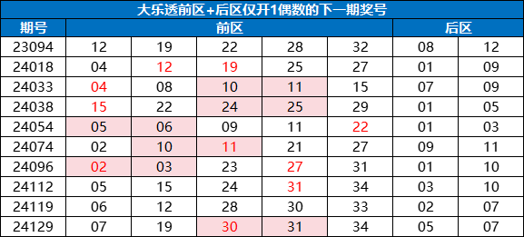 小编统计了近10次大乐透前区+后区仅开1枚偶数的下一期奖号,总结出几个特点可供彩民选号时参考。首先是龙头凤尾方面,"一奇一偶"的组合共出现8次且近6次全部开出,下期彩民选号时可多加参考。形态方面,连号形态共开出6次,占比超过一半;重号形态共开出8次,占比达80%,下期选号时或许可在129期的前区5码当中选择。