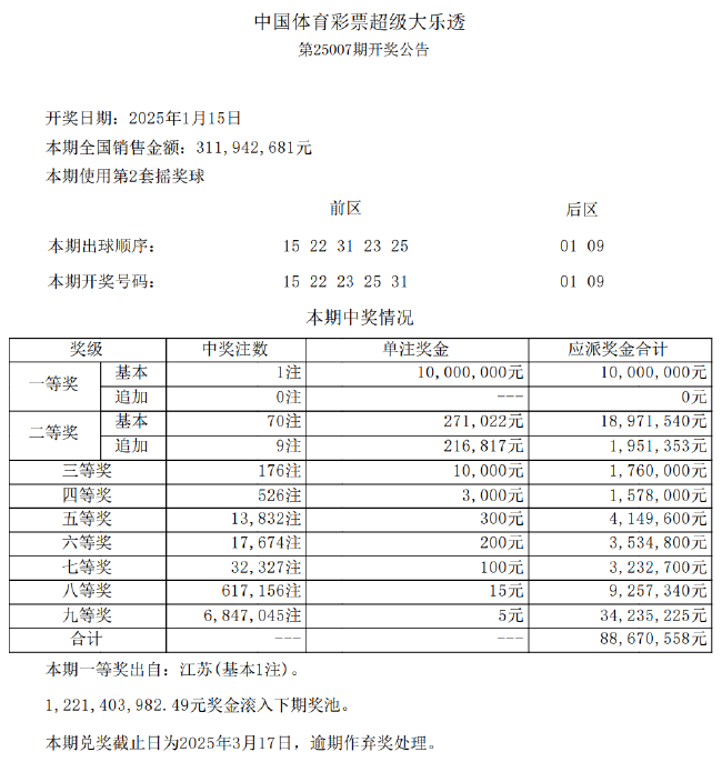 本期仅开出1注一等奖花落江苏,单注奖金1000万元,遗憾没有选择追加。二等奖开出70注,单注奖金27.1万余元,其中9注采用追加投注,每注多得奖金21.6万余元。本期全国销量为3.11亿元,奖池方面,12.21亿余元滚存至1月18日(周六)开奖的第25008期。