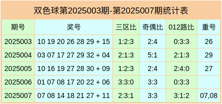 双色球第2025007期开出奖号为:07、08、14、18、21、27 + 11,红球三区比2:3:1,奇偶比为3:3,012路比为3:1:2,开出2枚重号07,08。