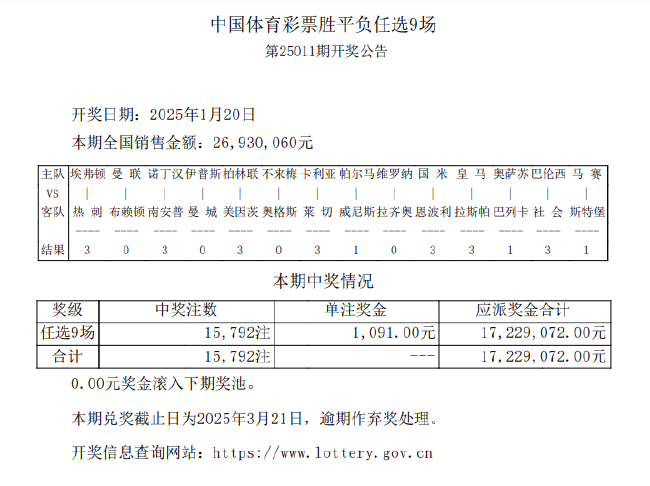 北京时间1月20日,胜负彩第25011期任九开奖结果揭晓。本期任九爆出15,792注,单注奖金1,091元,本期任九的投注总额为26,930,060元。