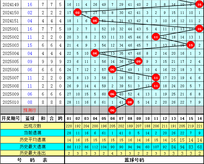 开奖回顾:双色球第2025010期开出奖号为:04 06 07 16 17 21 + 08,其中红球奇偶比为3:3,遗漏期数分别为0期、12期、2期、1期、1期、2期,遗漏总值为18期,蓝球遗漏期数为52期。