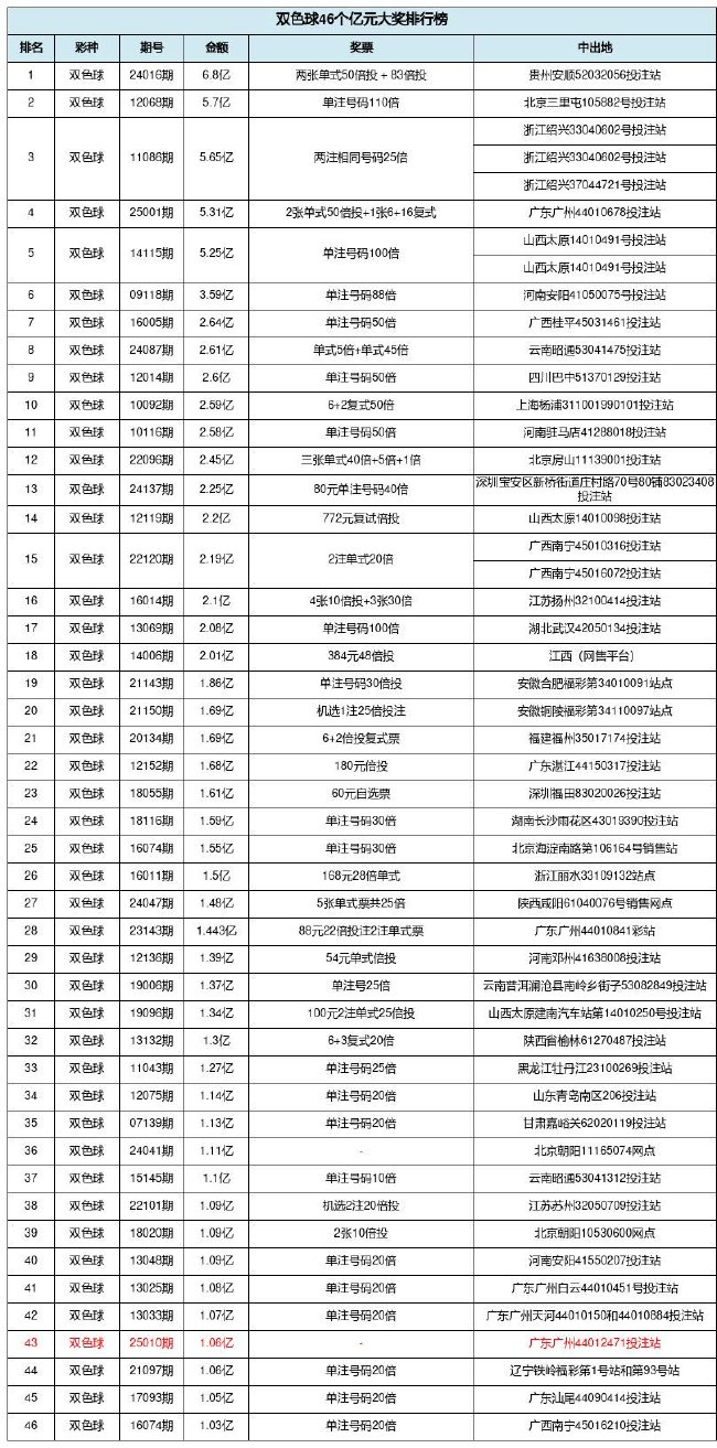 值得注意的是,2025年至今双色球仅开奖10期就已2次爆出亿元巨奖,且均出自广东。此前第25001期开奖,双色球刚爆出国内彩市排名第4的5.31亿巨奖,距本次1.06亿仅相隔21天。同时,本次1.06亿还是福彩双色球游戏开出的第46个亿元奖,目前排名第43位。