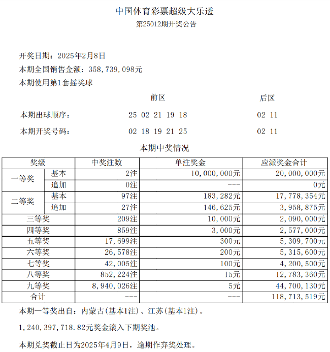 本期全国仅开出2注一等奖,单注奖金1000万元,遗憾没有选择追加,2注头奖分落内蒙古和江苏。二等奖开出97注,单注奖金18.3万余元,其中27注采用追加投注,每注多得奖金14.6万余元。本期全国销量为3.58亿元,奖池方面,12.40亿余元滚存至2月10日(周一)开奖的第25013期。