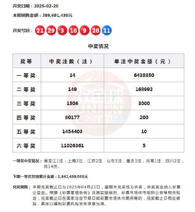 22:08 本期一等奖开出14注,单注奖金643万元,分落7地,其中山东中出5注,或爆3219万大奖,上海、江苏、四川各2注,黑龙江、重庆、河南各1注。二等奖开149注,单注奖金16.8万余元。本期双色球全国销量为3.89亿元,计奖结束后奖池余额为18.42亿余元。