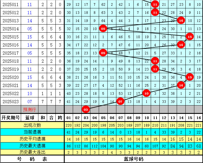 上期开出蓝球号码07,该号码在最近300期中出现了13次,其下期分别开出:蓝球03出现3次,蓝球08出现2次,蓝球01、10、12、13、14、15、16出现1次,蓝球02、04、05、06、07、09、11出现0次。本期五码蓝球参考03、07、08、13、14,独蓝关注03。