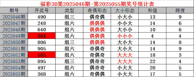上期回顾:福利彩票3D第2025055期开奖结果368。奖号:奇偶偶、小大大,和值17,跨度5。
