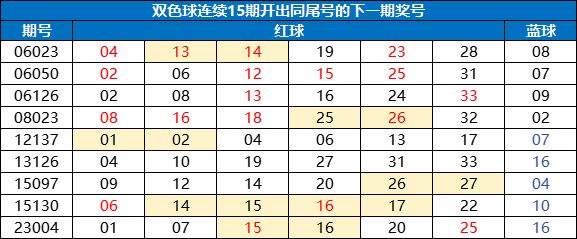 同尾号作为双色球开奖中的基本形态之一,一直深受彩民关注。在双色球开奖中,同尾形态连续开出并不罕见,但连续15期开出在历史上也仅出现过9次,由此可见近期该形态的火热。小编回查了这9次相同情况的下一期奖号,总结出以下几个特点,可供彩民选号时参考。