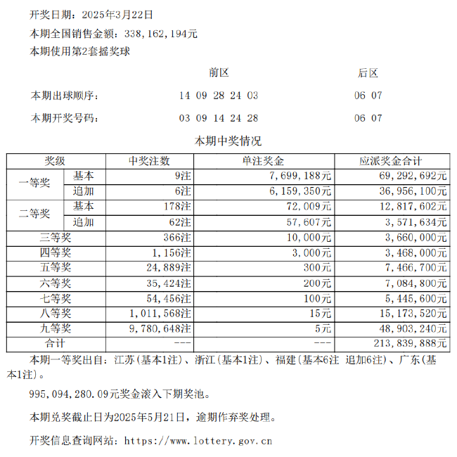 本期全国销量为3.38亿元,奖池方面,9.95亿余元滚存至3月24日(周一)开奖的第25031期。