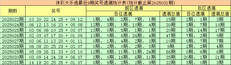 上期回顾:体彩大乐透第2025031期开出奖号为:14 18 20 25 35 + 01 07,其中前区各位奖号分别遗漏:0期、9期、2期、2期和9期,遗漏总值为22期,后区号码分别遗漏3期和0期,遗漏总值为3期。