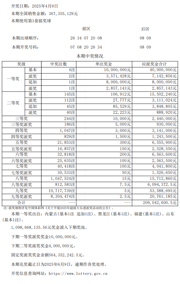 同时,本期一等奖1000万派奖奖金全部派出,下期一等奖派奖奖金为1000万;二等奖400万元派奖奖金也全部派出,下期二等奖派奖金额为400万;固定将派奖奖金剩余金额为564,352,242.5元。
