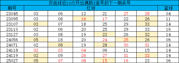 日常选号中,奇偶和连号是非常重要的参考条件,所以当它们二者相结合时,就更需要引起我们的关注。数据显示,在双色球过去3285期开奖中,偶数3连号形态一共只出现过157次,开出概率仅有4.7%,其罕见程度可见一斑!