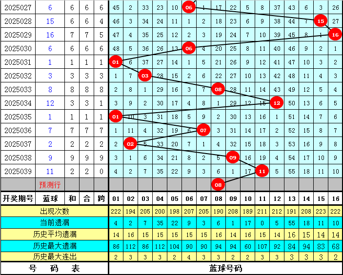 蓝球分析:上期蓝球为2路奇数号码11,最近10期2路奇数蓝球仅出现1次,本期关注2路偶数蓝球,推荐一码蓝球08。