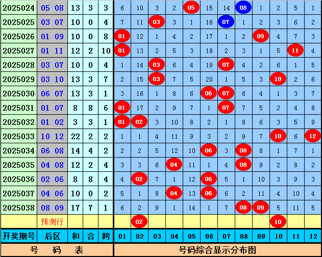 后区分析:在第039期历史同期开奖中,和值大小为8:10,跨度奇偶比为12:6,本期后区注意两码02和10。