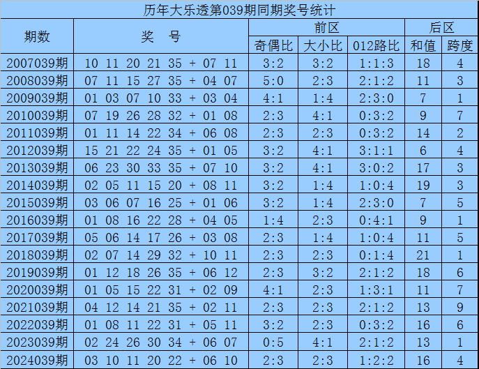 袁军师体彩大乐透第2025039期历史同期奖号分析: