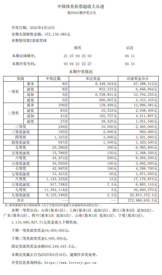 北京时间4月16日晚,体彩超级大乐透第25041期开奖,同时本期也是大乐透8.8亿大派奖活动的第4期,当期开奖号码为:03 04 21 22 27 + 05 11。