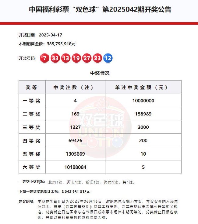 北京时间2025年4月17日,福彩双色球第25042期开奖,以下是详细开奖流程: