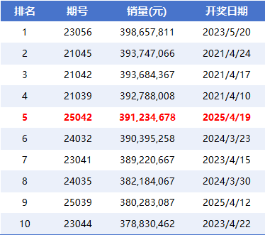 北京时间4月19日晚,体彩大乐透第25042期,同时也是大乐透8.8亿派奖活动的第5期开奖。值得注意的是,当期销量达到3.91亿多元,跻身大乐透历史单期销量TOP5!