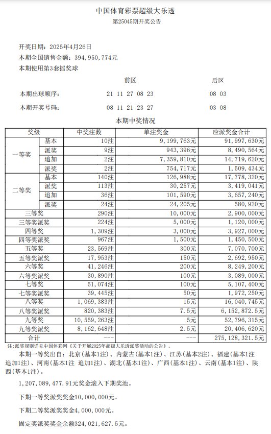 本期全国销量为3.94亿元,奖池方面,本期开奖结束后,12.07亿元滚存至4月28日(周一)开奖的第25046期。
