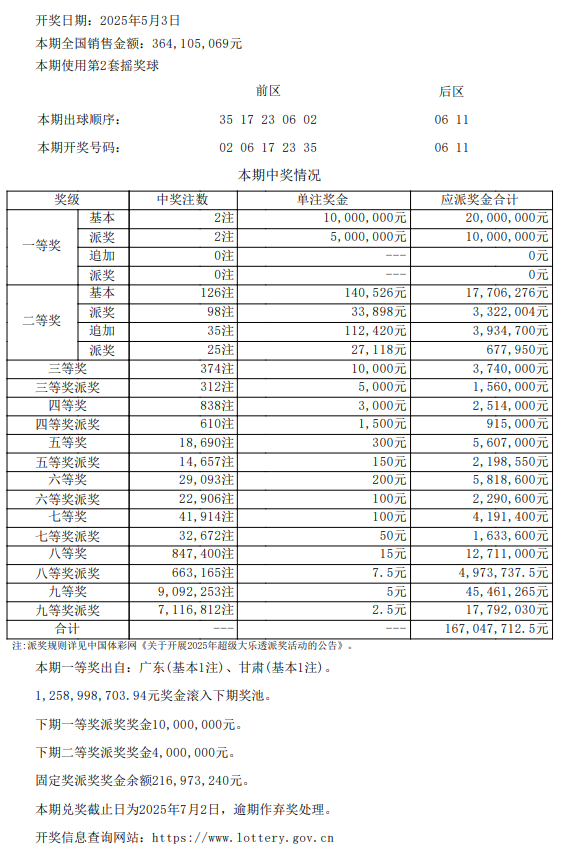 本期全国共开出2注一等奖,单注奖金1000万元,2注均享基本头奖派奖,每注多得500万元,单注奖金达到1500万元,分落广东、甘肃。