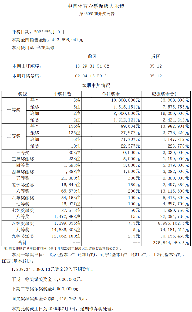 北京时间5月10日晚,体彩超级大乐透第25051期开奖,同时本期也是大乐透8.8亿大派奖活动的第14期,当期开奖号码为:02 04 13 29 31+05 12。值得注意的是,第25051期销量达到4.02亿多元,创造大乐透历史单期销量纪录,排名第一!