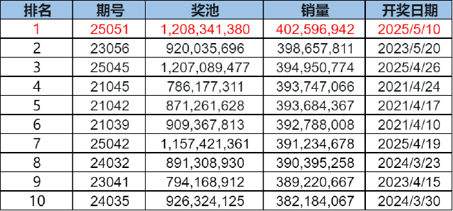 本期全国销量为4.02亿元,奖池方面,本期开奖结束后,12.08亿元滚存至5月12日(周一)开奖的第25052期。