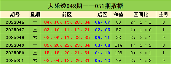 上期回顾:上期奖号:前区15、18、20、21、34.后区04 10。前区号码大小比为4:1,三区比0:4:1,奇偶比2:3,前区开出连号20 21,开出重号20 34。