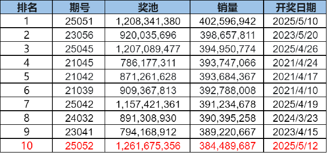 本期全国销量为3.84亿元,奖池方面,本期开奖结束后,12.61亿元滚存至5月14日(周三)开奖的第25053期。