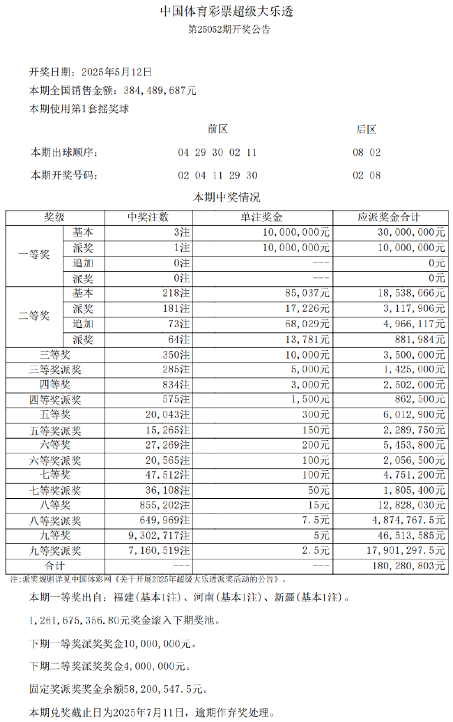北京时间5月12日晚,体彩超级大乐透第25052期开奖,同时本期也是大乐透8.8亿大派奖活动的第15期,当期开奖号码为:02 04 11 29 30+02 08。值得注意的是,第25052期销量达到3.84亿多元,跻身大乐透历史单期销量TOP10!