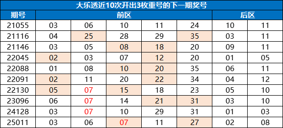 重号形态作为大乐透开奖中的基本形态之一,因其十分常见又能快速定位奖号的特点,一直深受彩民关注。而单期开出3枚重号的情况则较为稀有,在大乐透过去的2719期开奖(除去第一期)中也仅出现过38次,开出率仅为1.3%!小编整理了近10次大乐透开出3枚重号的下一期奖号,总结出以下几个特点可供彩民参考。