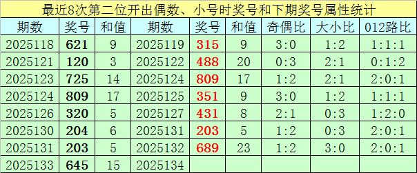 前7次第二位号码开出偶数、小 号时奖号分别为:621、120、725、809、320、204、203,其中奇偶总比例为7:14,有5期奇偶比与上期奇偶比相同;号码大小总比例为5:16,有2期奖号大小比与上期大小比相同;