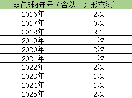 说回4连号形态,这在双色球奖号中并不常见。据笔者统计,今年这一形态也只现身过两次,而这两次之间仅间隔7期,可以说这一罕见形态在近期有明显的回温。而4连号形态在近10年间,每年出现的次数在0-2次之间,还从未超过2次,今年时间还未过半就已经现身2次,或许有望打破这一纪录。