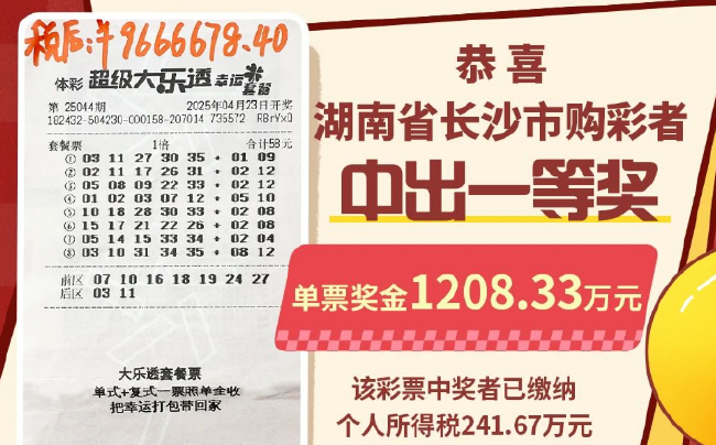 4月23日晚,体彩超级大乐透第25044期开奖中,湖南省购彩者喜中1注1208.33万元一等奖(含派奖奖金),花落长沙市望城坡街道迎春路110号南家塘小区13栋4301001670体彩实体店。4月24日清晨,中得大奖的一对年轻夫妻便急匆匆地来到湖南体彩服务大厅兑领奖金。