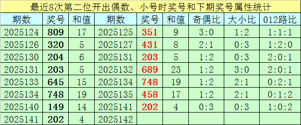 前7次第二位号码开出偶数、小 号时奖号分别为:809、320、204、203、645、748、149,其中奇偶总比例为7:14,有1期奇偶比与上期奇偶比相同;号码大小总比例为7:14,有3期奖号大小比与上期大小比相同;