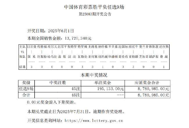 北京时间6月1日,胜负彩第25083期任九开奖结果揭晓。本期头奖开出45注,单注奖金195,133元,是2025年至今足彩任九开出的最高奖金,本期任九的销量为13,720,340元。