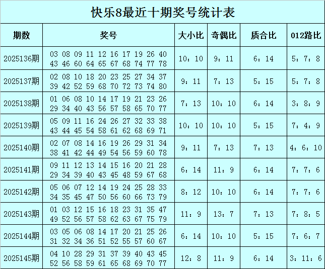 福彩快乐8第2025145期开奖回顾:04 10 28 29 31 37 39 40 43 45 52 56 58 59 61 65 68 69 70 77,其中奖号大小比开出12:8,奇偶比开出11:9,质合比开出6:14,012路比开出3:11:6。