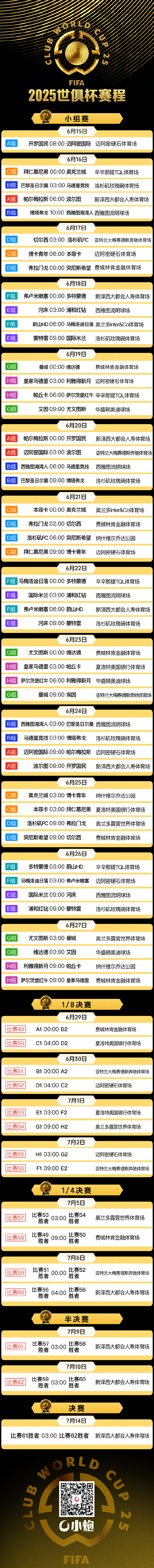 北京时间6月15日(周日)早8点,2025国际足联俱乐部世界杯(简称:世俱杯)揭幕战将正式打响,迈阿密国际坐镇迈阿密硬石体育场,对阵开罗国民。世界足坛的顶级盛宴即将拉开序幕,最新世俱杯完整高清版赛程长图来袭!