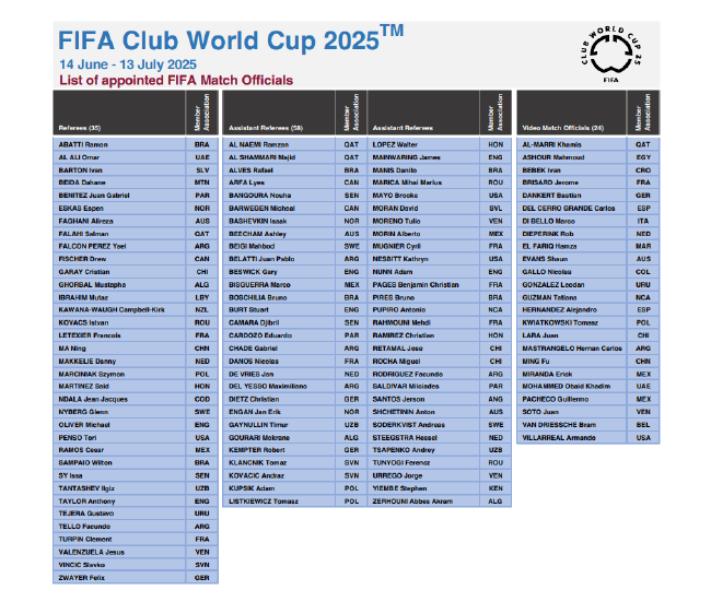 2025年国际足联俱乐部世界杯将于北京时间2025年6月15日至7月14日在美国举行,这是世俱杯改制后的首届赛事,也是裁判首次佩戴执法记录仪的比赛。值得一提的是,本届世俱杯裁判名单中,有两名中国籍裁判入选。