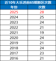 考虑到大乐透开奖的随机性,前区断区属于一种比较常见的形态。上期前区二区空开,是大乐透近10期开奖中第5次出现断区现象,也是今年65期开奖中第28次断区,热度属实不低。小编回查了近10年大乐透前65期开奖,今年的断区现象是最多的,而上一次同时期超过28次断区,还要追溯到2013年,当时前65期开奖共有30次出现断区。