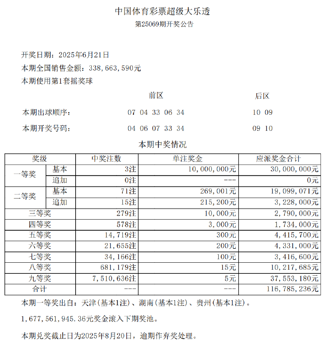 北京时间6月21日晚,体彩大乐透第25069期开奖,当期开奖号码为前区04 06 07 33 34,后区09 10。