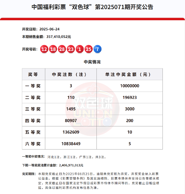 22:06 本期一等奖开出3注,单注奖金1000万元,3注头奖分落河北、浙江和广东3地。二等奖开出110注,单注奖金19.6万余元。本期双色球全国销量为3.57亿余元,计奖结束后奖池余额为24.06亿余元。