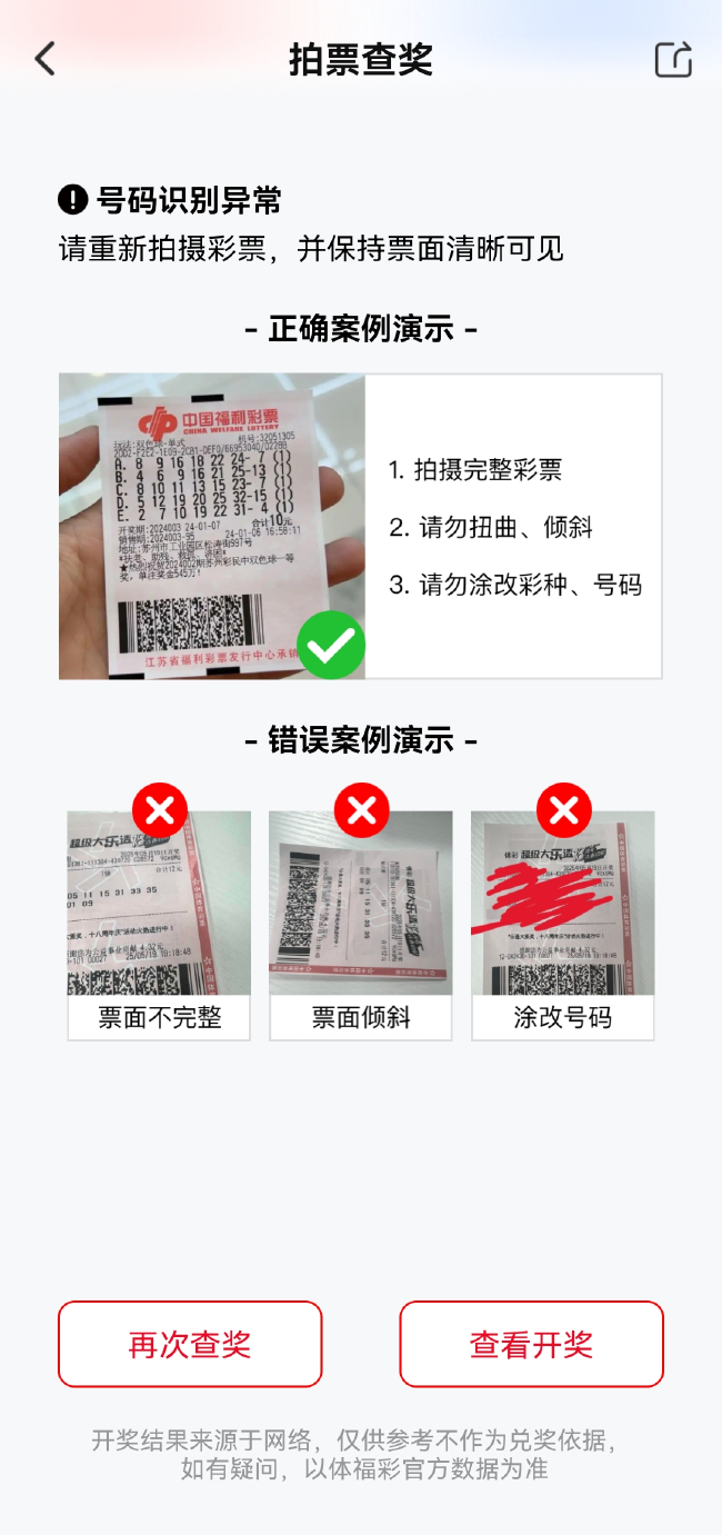 如果拍票后显示号码识别异常,请检查您拍摄的彩票是否完整并清晰可见,并根据提示进行调整。