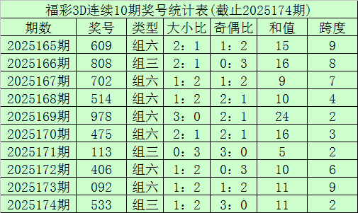 开奖回顾:福利彩票3D第25174期奖号开出533。奖号类型为组三,奇偶形态为奇奇奇,大小形态为大小小。
