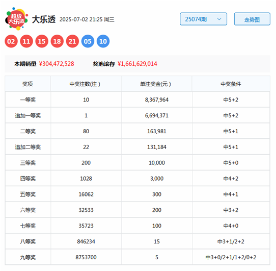 大乐透第2025074期开奖,前区:02、11、15、18、21;后区:05、10。其中前区012路比为3:0:2,奇偶比为3:2,和值为67,跨度为19,后区开出2路+1路号码。