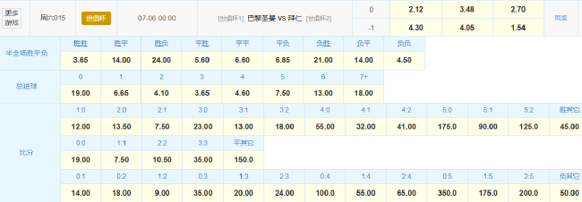 竞彩官方为本场比赛开出2.12(大巴黎胜) 3.48(平) 2.7(拜仁胜)的数据组合,对大巴黎稍有倾向,平赔3.48的数据算是拉的比较高的,形成一定阻力。总进球数中,3球为1赔3.65最低,这算是比较常规的数据,但需要注意的是7+也只有1赔18。比分方面,2-1和1-1为1赔7.5最低,但1-2也只有1赔9,胜其他和负其他的赔率都仅有1赔45和1赔50。